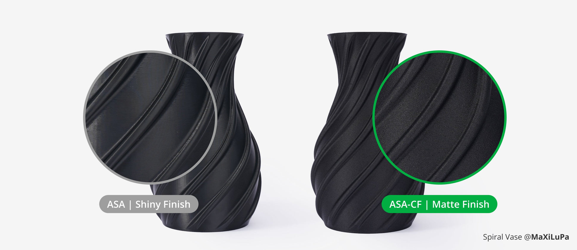 Короткі вуглецеві волокна надають відбиткам ледь помітного матового, рівномірного покриття, яке приховує лінії шарів, забезпечуючи елегантний, однорідний вигляд — ідеально підходить для всього: від механічних застосувань до полірованих елементів для зовнішнього використання.